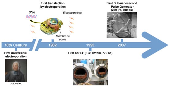 Timeline of main events in the development of electric pulse technology. The first application of electric pulses was recorded in 1754 with the experiments performed by J. A. Nollet. Two centuries later, in 1982, E. Neumann et al. [] coined the term electroporation to describe the use of electric pulses to create membrane pores allowing the insertion of genetic material into cells. Afterwards, in 1995, Schoenbach et al. [] developed the first nsPEF technology to prevent biofouling of cooling systems. Lately, the construction of an IRA in 2007 by Heeren et al. [], allowed the application of sub-nanosecond pulses.