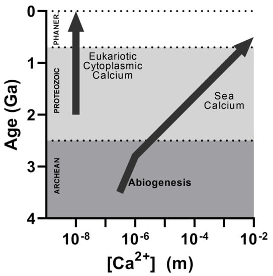 Accumulated knowledge from molecular biology allows us to better understand the relationship between inner cell Ca homeostasis and its role in the evolution of the eukaryotic cells []. A paleobiological hypothesis postulates that the prehistoric alkaline ocean contained extremely low Ca concentration []: i.e., life emerged from a calcium-free medium (Figure 2). This hypothesis agrees with the fact that all life forms on Earth are supported by cells containing low cytoplasmic Ca concentrations, a necessary condition to not perturb ATP metabolism since phosphate precipitates in the presence of Ca []. Eukaryotic cells can achieve cytoplasmic nanomolar concentrations of Ca by distributing it in organelles. These internal reservoirs allows a fast and focal release of Ca at specific cell sites, generating a variety of cellular signals as a consequence of its reversible binding to calcium-binding proteins (CaBP) [,]. Thus, evolution took advantage of the increase of calcium in the internal media by turning calcium into a pleiotropic second messenger []. Calcium’s evolutionary protagonism is highlighted by an increase in the number of CaBP along evolution, which rises from nearly 70 in bacteria to more than 3600 in mammals [,], therefore improving the ability of eukaryotic cells to fine tune Ca signals []. In this regard, nsPEF may represent a technological key suitable to open the Ca Pandora’s box in cells, turning over the recalcitrant evolutionary path of life tending to exquisitely regulate the internal Ca concentration and providing us with a unique tool to manipulate cellular metabolism.