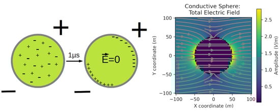 Schematic representation of the movement of charges inside a simplified model of a cell containing positive and negative charges under the application of an external electric field. After a suitable elapsed time, for instance 1 s, the movement of charges reaches an equilibrium, resulting in the electric field inside the cell being nullified. Right panel showing the total electric field extracted from https://em.geosci.xyz (accessed on 27 April 2022).