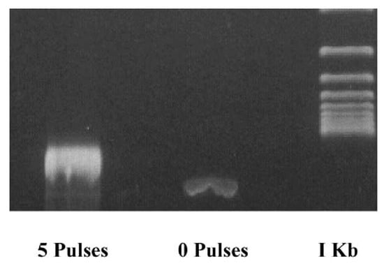 Figure 5. Electrophoresis of DNA extracted from Jurkat cells right after nsPEF (60 kV/cm, 60 ns, 5 pulses). The appearance of a smeared DNA band in the first lane is congruent with DNA damage induced by nsPEF. Taken from []. Reproduced with permission.