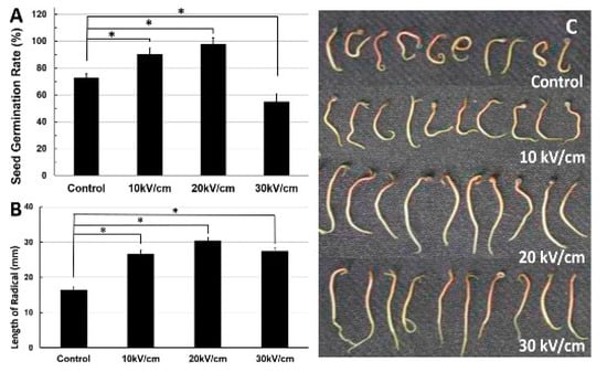 - Seed germination: nsPEF (10–30 kV/cm, 100 ns, 20 pulses) application significantly affected seed germination and pre-growth of Haloxylon ammodendron (Figure 7). This is probably due to the exogenous and endogenous NO generated in the nsPEF seed-treatment system []. For related studies see [,].