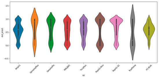 Experimental setup—a clone was generated from a single human ES cell (H1) that is considered normal and without known chromosomal aberrations. The clonal cells were dissociated and picked using the CellCelector (ALS) automated cell picker. The cells were then processed using different single-cell WGA kits (see [16] Methods section). Following single-cell WGA, the DNA samples were processed targeted for STR loci using the DuMIPs pipeline [6,17]. We analyzed the coverage (Figure 2), allelic balance (Figure 3), consistency (Figure 4), amplification noise (Figure 5), and mapping rates (Figure S2).
