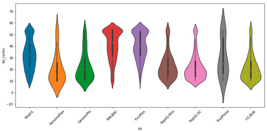 STR sensitivity to amplification error is well known and has been accurately calibrated under varying degrees of PCR amplification as part of the STR stutter genotyping tools used here [6]. The genotyping provides the simulated stutter pattern closest (correlations of no less than 0.95) to the measured histogram of STR lengths, with the simulation seed being the genotype itself and the number of simulated amplification cycles (values are equivalent to PCR cycles) serving to compare the amplification noise that results from the various WGA kits (Figure 5). Here, we note a clear separation between the MDA and PCR-based kits, whereby the latter are noisier, exhibiting the equivalent to 10~20 additional PCR cycles.