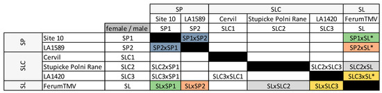 The six parental lines and 14 F1 hybrids (HF1) studied in the factorial design. Names are abbreviated to indicate the species the parental lines belong to. HF1 are named after the “female” × “male” they originate from. ‘*’ indicates that the HF1 was also studied in [25]. Pairs of reciprocal HF1 are represented in the same color. ‘SP’: S. lycopersicum pimpinellifolium; ‘SLC’: S. lycopersicum var. cerasiforme; ‘SL’: S. lycopersicum var. lycopersicum.