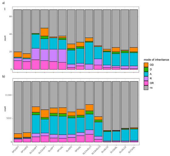 Overall modes of inheritance per cross for: (a) 66 metabolites, SSC and weight and (b) 12,896 differentially expressed genes (DEGs). The height and color of the barplot indicate the number of traits or DEGs with a specific mode of inheritance. Modes of inheritance are classified as over-recessive (‘OR’), recessive (‘R’), additive (‘A’), dominant (‘D’) or over-dominant (‘OD’) in a given cross. Traits or DEGs that show no significant difference (‘ns’) between at least two individuals of the cross (the two parental lines and HF1) are filled in grey.