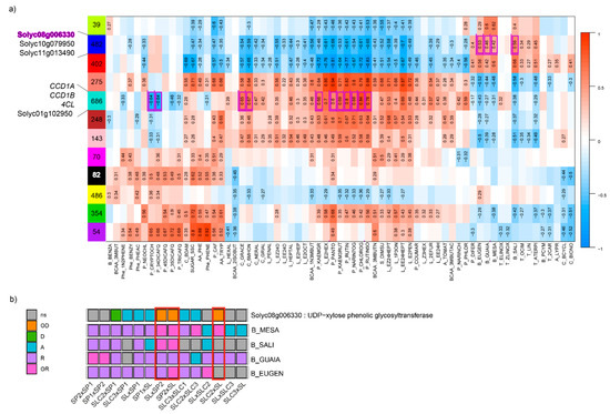 To bridge the gap between metabolite content and gene expression, we carried out RNA-sequencing followed with DEG analysis. From the 13,127 genes that passed the quality control filters, more than 98% showed significant differential expression between at least two individuals, the genotype factor being central to the expression variations observed (Figure S4). We computed a co-expression network analysis between the 12,896 DEGs and identified 12 different co-expression modules. Two modules exhibited significant enrichment in biological functions associated with key VOCs and phenolics (Table S3). We computed correlations between gene expression and metabolite content and suggested candidates when their biological function has previously been proposed to play a role in the metabolite synthesis. Apart from the cloned genes CCD1A, CCD1B and 4CL that participate to the synthesis of carotenoid-derived VOCs and phenolics, respectively, we also identified candidates already suggested by [27]. Among the 91 candidate genes correlated to at least one metabolite, nine were also reported by these authors following GWAS analyses of line and test cross panels. Moreover, three of them presented a significant cis-regulation pattern according to an ‘expression GWAS’ performed by [23]. Integrating multi-omics datasets aims at combining evidence pointing in the same direction to better pinpoint causal genes. In that respect, we suggest Solyc08g006330 annotated as a ‘UDP-xylose phenolic glycosyltransferase’ as a candidate gene related to benzenoid VOCs: (i) This gene belongs to the blue module significantly associated with ‘glycosyltransferase’ terms; (ii) we found significant negative correlations with the four benzenoid VOCs (GUAIA, MESA, SALI and EUGEN) whose synthesis depends on glycosyltransferase genes; (iii) this gene was comprised within the Quantitative Genomic Regions defined by [43] for phenylalanine and benzenoid VOCs and [25] reported significant association of the gene with BENZA, another benzenoid VOC; (iv) a significant cis-regulation pattern was reported by [23]. Based on the negative correlations we reported, further work will be necessary to investigate the possible conjugation mechanism of benzenoid VOCs underlined by this gene as conjugation of such compounds prevent their release upon ripening [44].