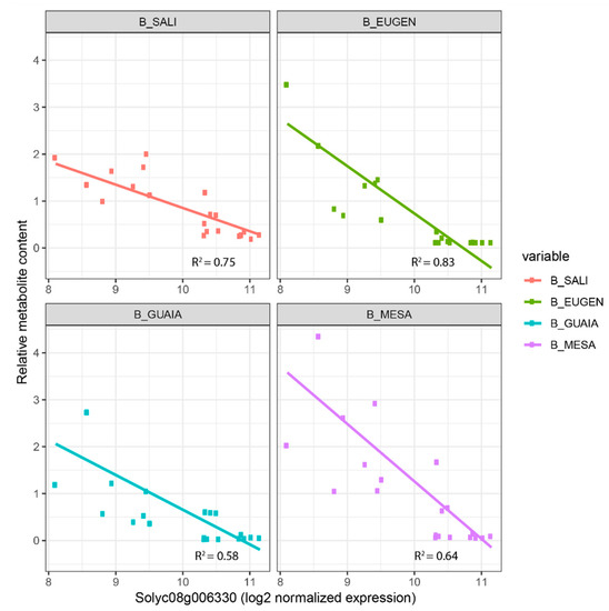 As part of the integration analysis, correlations were computed between the genes within each module and the different metabolites. We present in Table S4 the metabolite-gene significant correlations when the biological function of the gene has previously been proposed to play a role in the metabolite synthesis. In the turquoise module, we found the two carotenoid cleavage dioxygenase cloned genes CCD1A and CCD1B correlated with GRACE and 6MHON (correlation = 0.62 and 0.74, respectively) and 6MHON (0.56), respectively. For phenolic compounds, we found the cloned gene 4CL, which is annotated as a ‘4-coumarate:CoA ligase’. This gene catalyses the last step of the overall phenylpropanoid pathway before the pathway is ramified into flavones or non-volatile phenylpropanoids [36]. We found strong positive correlations between the gene expression and seven phenolic compounds (up to 0.9 for CHLOROG, p-value = 5.1 × 10−23). Within this module, we also identified Solyc01g102950 annotated as a ‘Lycopene beta/epsilon cyclase protein’ and not yet cloned as a QTL, with a correlation of 0.58 (p-value = 1.01 × 10−6) with 6MHON. In the blue co-expression module, we identified three glycosyltransferase genes (Solyc08g006330, Solyc10g079950 and Solyc11g013490) whose expressions were correlated to the contents of four benzenoid VOCs (MESA, GUAIA, EUGEN and SALI) for Solyc08g006330 and Solyc10g079950, while Solyc11g013490 expression was correlated to three benzenoid VOCs (EUGEN, GUAIA and MESA). We found a negative correlation between Solyc08g006330 expression and the four benzenoid VOCs (down to −0.66 for SALI, p-value = 7.03 × 10−9), while the two other genes displayed positive correlations for the VOCs they were correlated to (up to 0.68 for Solyc08g006330-SALI, p-value = 7.03 × 10−9). When we looked at the mode of inheritance of the four benzenoid VOCs in light of the mode of inheritance of Solyc08g006330, we identified consistency (with opposite effect): MESA exhibited over-recessiveness in three crosses where Solyc08g006330 was over-dominant (Figure 3b). Figure 4 displays linear regressions of the four benzenoid VOCs according to Solyc08g006330 expression. The highest the gene expression, the lowest the corresponding metabolite content with coefficients of determination ranging from 0.58 (GUAIA) to 0.83 (EUGEN).