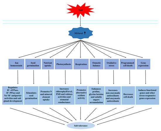 Salt stress decreases the height, fresh weight, total dry weight, photosynthetic pigment content, and protein content of plants. The inhibitory effects of salt stress can be alleviated by exogenous NO treatment in wild barley [15]. Exogenous application of SNP increased the fresh weight and shoot/root elongation of Nitraria tangutorum seedlings under salt stress. Leaf senescence and root damage induced by salt stress were also alleviated. Meanwhile, application of the NO scavenger cPTIO and mammalian NOS inhibitor L-NAME significantly worsened stress-induced damage under high-salt conditions [16]. In plants, NO alleviates the damage caused by salt exposure via several strategies (Figure 1), as summarized below.