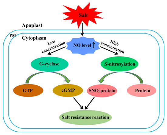 NO, as a major signaling molecule, plays an important role in plant growth and development and in plant resistance to various environmental stimuli, including salt stress [5]. Under saline conditions, plants promote NO synthesis mainly by increasing the activity of a NOS-like enzyme or NR and by inhibiting the activity of GSNOR.
