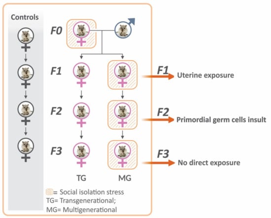 Females from the parental generation (F0, n = 37) were randomly divided into control or SIS groups and bred with stress-free males to produce the filial (F) generation (F1), and their subsequent F2 (granddaughters) and F3 (great-granddaughters) offspring. Timed-Pregnant female rats from the F1–F3 generations were randomly split into transgenerational (TG) or multigenerational (MG) stress lineages (Figure 1).
