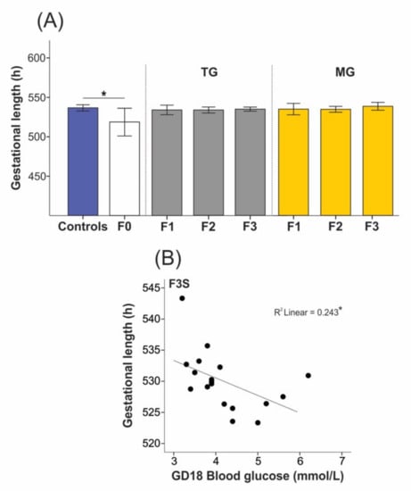 Gestational lengths were significantly decreased in the F0 stress groups compared to group-housed controls (519.23 ± 24.73 h vs. 530.06 ± 9.26 h, p = 0.045; Figure 2A). Pregnancy duration was not reduced in the F1–F3 offspring of the TG group (F1 529.35 ± 7.00 h; F2 528.08 ± 5.78 h; and F3 529.27 ± 3.72 h; p = 0.751; Figure 2A) compared to controls. Similarly, gestational length did not change in the F1–F3 offspring of the MG group (F1 527.81 ± 6.53 h; F2 527.59 ± 4.96 h; F3 531.19 ± 5.64 h; p = 0.412; Figure 2A). Although the overall gestational length was not affected in SIS-exposed F3 offspring, increased blood glucose levels on gestational day (GD)18 were associated with shorter gestation length (r(16) = −0.493, p = 0.038; Figure 2B).