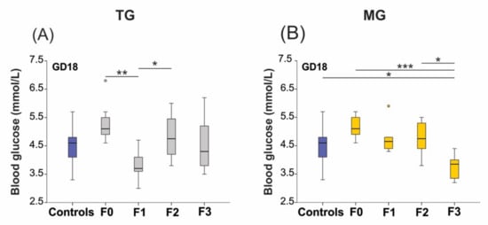 Blood glucose levels decreased on GD18 in the offspring of animals exposed to social isolation prenatal stress. (A) Blood glucose levels significantly decreased in F1 animals of the TG group (A) and the F3 generation of the MG group (B) on GD18. Asterisks indicate significance: * p < 0.05; ** p < 0.01; *** p < 0.001. Controls n = 20–28; F0 n = 10–11; F1 n = 6–8, F2 n = 10–12; F3 n = 8–11. Box plots mid-lines indicate medians, whiskers indicate min-max values, and boxes indicate interquartile ranges.