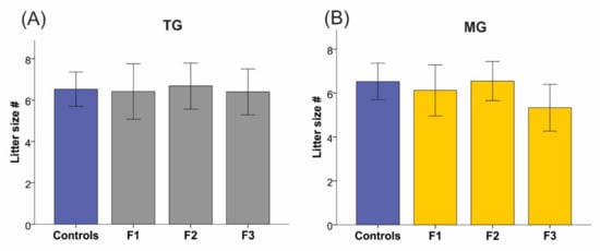 Maternal (TG p = 0.212; MG p = 0.372; Table 2) and gestational weights (TG p = 0.631; MG p = 0.565; Table 2) were unchanged in all groups and generations. Maternal weight gain calculations revealed no changes in either group (TG p = 0.189; MG p = 0.167; Table 2). Furthermore, no differences in litter size were observed between generations in the TG (p = 0.355) and MG (p = 0.351) stress lineages (Figure 4).