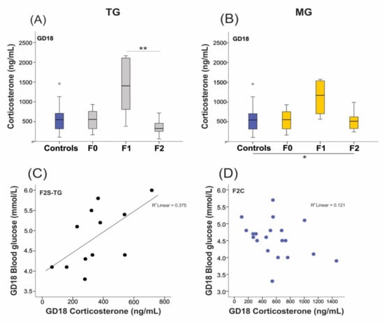 Plasma CORT levels are measured to confirm the presence of stress. Unexpectedly, plasma collected on GD18 displayed basal CORT levels in F0 stressed animals (543 ± 261 ng/mL; Figure 5A) compared to controls (582 ± 332 ng/mL). Levels of CORT were significantly increased in the F1 generation (1399 ±722 ng/mL, p = 0.001) of the TG lineage than those of F2 animals (350 ± 179 ng/mL; Figure 5A). The MG lineage demonstrated an overall increase in CORT levels (p = 0.037) (Figure 5B), and higher CORT levels were associated with increased blood glucose levels on GD18 in F2 TG-stressed animals (Figure 5C,D).
