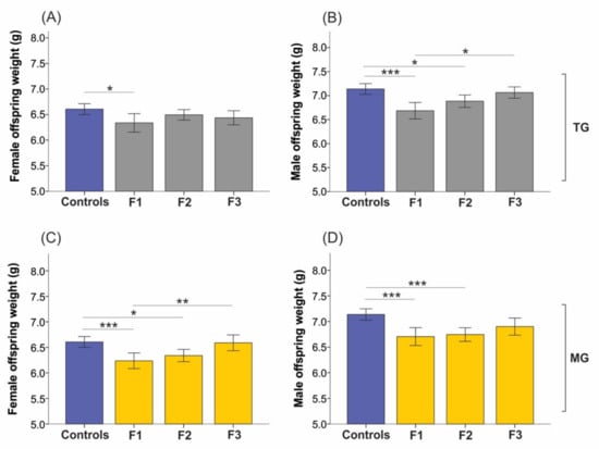 In the cumulative SIS-exposed MG lineage, F1 and F2 females (F1 6.24 ± 0.48 g, p = 0.001; F2 6.34 ± 0.50 g, p = 0.010) and males (F1 6.70 ± 0.53 g, p = 0.001; F2 6.74 ± 0.57 g, p < 0.001) displayed significantly lower weight on P1 than controls (Figure 6C,D). Conversely, F3 MG-stressed females were significantly heavier at birth than F1 neonates (6.59 ± 0.54 g vs. 6.24 ± 0.48 g, p = 0.009; Figure 6C).