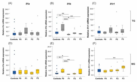 Uterine expression of the proinflammatory cytokine interleukin-1α (Il1a) was not significantly different in either TG (p = 0.498) or MG (p = 0.744) stress groups (Figure 7A,D). On the contrary, Il1b mRNA expression doubled in the stressed F0 generation compared to controls (p = 0.026), but then it dropped in the TG F1–F3 offspring as compared to its parental generation (overall p < 0.0001; Figure 7B). Similarly, Il1b expression in the MG lineage (p < 0.0001) displayed a pattern akin to TG stress, except that the differences in F3 animals did not reach significance (F0–F3 p = 0.112) (Figure 7E). In the MG group, Il1b abundance decreased significantly in the F1 (p < 0.0001) and F2 (p = 0.003) progeny compared to F0 uteri (Figure 7E). The expression of interleukin-1 receptor 1 (Il1r1) significantly increased in the F3 generation of the MG group (F0–F3 p = 0.005; Figure 7F), but its expression was unchanged in the TG lineage (p = 0.205; Figure 7C). Results for the interleukin-6 (IL-6) proinflammatory cytokine were not included in the analysis, as the mRNA expression in control animals displayed variability within generations.