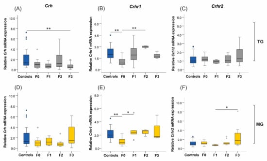 The uterine expression of Crh and Crhr2 reacted differently in TG and MG lineages, while Crhr1 expression patterns were similar. (A) The mRNA expression of Crh was significantly reduced in the F3 generation of the TG group, (D) yet, no changes were observed in the MG lineage. (B) The Crhr1 expression significantly decreased in F0 animals while its abundance tripled in the TG F2 generation. (E) The same pattern was observed in the MG lineage, where uterine expression of Crhr1 was significantly downregulated in the F0 generation but doubled in the F1 offspring (C). The expression of Crhr2 was unchanged in the TG lineage, while (F) it significantly increased in the F3 animals exposed to cumulative MG stress. Asterisks indicate significance. * p < 0.05; ** p < 0.01. Controls n = 20–31; F0 n = 8–10; F1 n = 5–8, F2 + F3 n = 4–12. Box plots mid-lines indicate medians, whiskers indicate min-max values, and boxes indicate interquartile ranges.