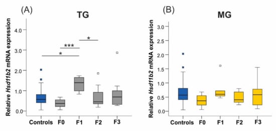 The 11β-HSD enzyme isoforms 1 and 2 modulate local GC metabolism in the uterus and placenta and regulate the timing of labour []. The 11βHsd2 isoform transforms CORT into its inactive dehydrocorticosterone form. In the TG lineage, Hsd11b2 mRNA levels tripled in F1 daughters (Controls-F1 p = 0.023, F0–F1 p < 0.0001; Figure 9A) and then normalized in the F2 generation (F1–F2 p = 0.036). In contrast, the uterine expression of the Hsd11b2 gene was unaltered in the MG group (p = 0.092; Figure 9B). The Hsd11b1 results were excluded due to significant variability observed in controls.