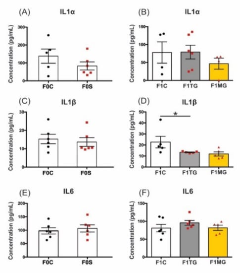 We performed multiplex protein analysis on three proinflammatory cytokines (IL-1α, IL-1β, and IL-6) related to the onset of labour []. Overall, protein concentrations of IL-1α, IL-1β, and IL-6 were unaltered in all F0 treatment groups (F0C–F0S p = 0.24; p = 0.65; p = 0.62, respectively; Figure 10A,C,E). In the F1 generation, however, IL-1β protein levels were significantly reduced in the TG lineage (F(2, 9) = 5.21, p = 0.031; Figure 10D) compared to controls (p < 0.05). A similar drop occurred in the F1 MG animals, but it was not significant. Conversely, IL-1α and IL-6 protein concentrations did not show significant differences in the F1 generation (F(2, 11) = 0.65, p = 0.54 and F(2, 14) = 0.97, p = 0.40; Figure 10B,F, respectively). The levels of IL-1α in the MG lineage demonstrated a decrease, but it was not significant (Figure 10B).