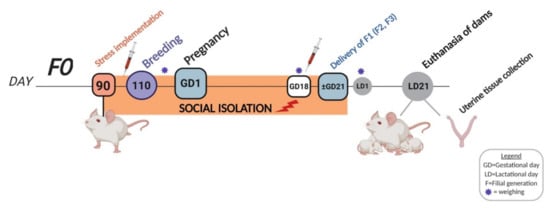 Timed-pregnant female Long–Evans hooded rats (n = 111) were used to produce a cohort of four generations (F0–F3) of stressed animals. Female rats were individually paired with stress-free males for one hour per day for mating. Breeding was initiated at 110 days of age and continued until pregnancy was detected or females reached 180 days of age (Figure 11). Pregnancy was confirmed by progressive maternal weight gain. Weight measurements were performed on GD18 for dams and P1 for pups. The gestational length was video-recorded from GD20 until birth continuously using an infrared cage site camera (Panasonic WV-BP330, Panasonic, Minato-ku, Tokyo, Japan), and was determined by the total number of hours between final mounting and delivery of the first pup. All pregnant dams were housed individually from GD19 until delivery. The pups were kept with their mothers until weaning (LD21) and then housed with same-sex siblings. Unhealthy dams were excluded from the study and adverse health outcomes were recorded for further analyses.