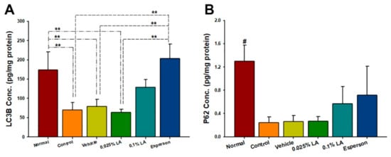 Autophagy is essential for skin homeostasis. The dysfunctional regulation of autophagy responses leads to several skin disorders, including psoriasis [13,14]. LC3 and p62 are two well-characterized autophagy biomarkers used to represent and quantify the status of autophagy [13,14,15]. Previous studies reported that LC3B protein expression was lower in psoriatic lesional skin than in non-lesional skin [16,17]. In comparison, p62 showed a higher mRNA expression in vitro [18] and a higher protein expression detected by western blot in vivo [19,20]. Our results confirmed decreased LC3B protein expression in IMQ-induced psoriasis-like lesioned skin, compared to normal non-treated skin. Unlike the previous reports, our ELISA results showed a downregulation repression pattern of p62 in psoriasis-like lesioned skin. However, the LC3B and p62 protein expression was upregulated by applying 0.25% desoximetasone ointment. Of importance, Hill et al. pointed out that autophagy is a dynamic process [13]. Additionally, Guo et al. reported higher levels of LC3B and lower levels of P62 of autophagic activity by using an ELISA kit in urticarial lesion rats [15]. Therefore, the sampling time, detected method or the sensitivity, and quality of ELISA kits may influence the autophagy-related protein, such as p62 expression results. On the other hand, our results showed that 0.1% LA was involved in regulating the local cutaneous Th-17/IL-23 axis related cytokines response; however, 0.1% LA treatment only showed a promoted response but without the statistical significance of the LC3B and P62 protein expression compared to the control group. This may imply that LA may involve cutaneous autophagy, but further study, by applying a higher dose of LA treatment, is needed.