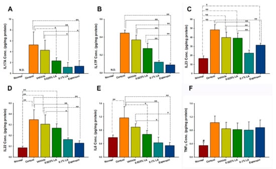0.1% LA and DXM Inhibited (A) IL-17A, (B) IL-17F, (C) IL-23, (D) IL-23, and (E) IL-6 but not (F) TNF-α Protein Expression in Psoriasis-like Skin. IL, interleukin; # p < 0.01, compared to all the other groups; * p < 0.05; ** p < 0.01.