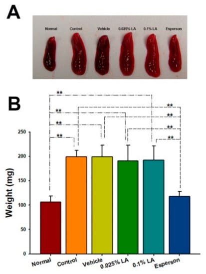 To clarify the systemic effect of LA in IMQ-induced psoriasis-like dermatitis, the spleen weight and Th-17/IL-23 axis-related cytokines from the spleen were examined. The topical treatment of LA did not reduce the enlargement of the spleen (Figure 4A) or spleen weight (p > 0.05; Figure 4B) after six consecutive days of IMQ application. However, Esperson treatment significantly reduced the enlargement of the spleen (Figure 4A) and reduced the spleen weight compared to the control, vehicle, and both LA treatment groups (p < 0.01; Figure 4B).