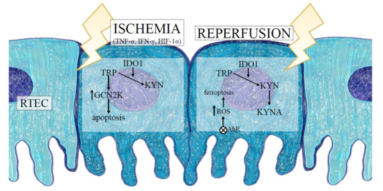 The aforementioned finding complies with a clinical study showing the presence of high KYN concentrations in serum and urine of kidney recipients during acute rejection, suggesting that IDO1-dependent KP activation may participate in graft injury [103]. Eleftheriadis et al. [104] demonstrated that in cultures of proximal RTECs surrounded by reoxygenation, the ferroptotic death of cells depended on the activation of AhR. Since KYN and a certain amount of downstream products of its metabolism, such as kynurenic acid (KYNA), are well known endogenous activators of AhR [105], it has been suspected that the reoxygenation-induced AhR activation could result from the IDO1 upregulation and the subsequent kynurenines overproduction. A recent study by Eleftheriadis et al. [106] confirmed the presented hypothesis, demonstrated that IDO1 was upregulated during anoxia and induced GCN2K-mediated apoptosis in RTECs, whereas the reoxygenation also upregulated IDO1, increased KYN levels, and triggered AhR-induced ROS generation, leading to AhR-mediated ferroptosis of these cells (Figure 2). In addition, the inhibition of IDO1 prevented both pathways, counteracting the damage of RTECs. These data, although limited only by the in vitro conditions, suggest that KP activation occurs in either phase of IRI and can contribute to kidney injury as a result of IRI.