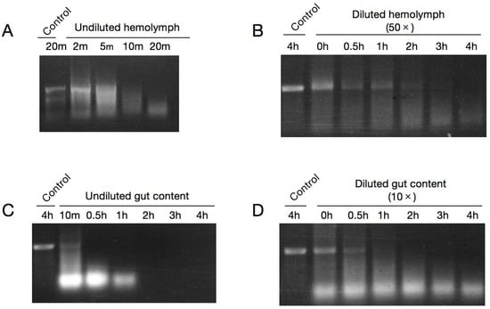 Representative gel images showing that dsRNA was rapidly degraded in either (A,C) undiluted or (B,D) diluted hemolymph and gut content collected from 2-day-old fifth-instar larvae. The relative stability of dsGFP was detected by 1% agarose gel electrophoresis after incubation for different time periods in 60 μL tissue extracts (hemolymph or gut content) or nuclease-free water (control). m, minutes; h, hours.