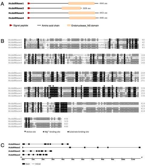 Deduced amino acid sequences analysis and gene structure analysis of HcdsRNases. (A) Domain arrangement in the aligned amino acid sequences of HcdsRNases. Red arrows indicate the location of signal peptides, orange boxes represent endonuclease NS domains, and gray lines represent amino acid chains. (B) Multiple sequence alignment of deduced HcdsRNase proteins. Residues highlighted in black and gray are conserved and similar, respectively. Signal peptides are underlined. Active sites are marked by triangles, the Mg2+ binding site by a star, and substrate binding sites by circles. (C) Gene structures of the HcdsRNases. Squares and lines indicate exons and introns, respectively, in individual HcdsRNase genes.