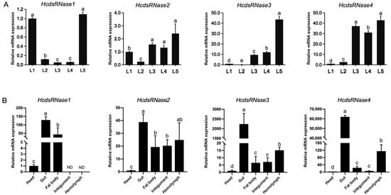 Expression profiles of the four HcdsRNase genes in H. cunea. (A) Relative expression level of HcdsRNases at different developmental stages of H. cunea. cDNA templates were prepared from total RNA isolated from 3-day-old larvae of each larval stadium (L1–L5). (B) Relative expression level of HcdsRNases in different tissues or body parts in H. cunea. cDNA templates were prepared from total RNA isolated from 2-day-old fifth-instar larvae dissected heads, guts, fat bodies, integuments, and hemolymph. β-actin was used as the reference gene. Values are the means ± SE from three replicates. Different letters on columns represent significant differences (p < 0.05). ND means nondetectable expression.