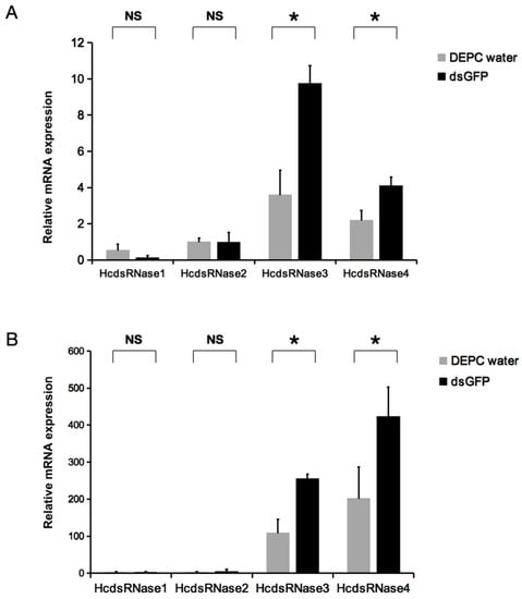 Relative mRNA expression level of the four HcdsRNase genes after dsGFP injection at (A) 24 h and (B) 48 h. Two-day-old fourth-instar larvae were injected with 2 μL of 6 μg dsGFP (black columns, the treatment group) or 2 μL DEPC water (gray columns, the control group). Error bars represent the standard error of the calculated means based on four replicates. * Asterisks indicate significant differences (p < 0.05). NS means no significant differences.