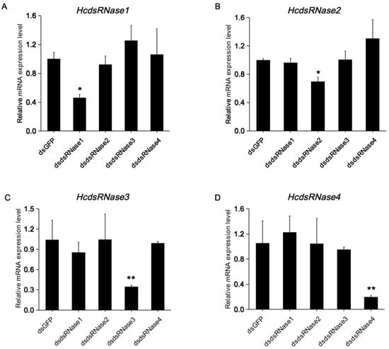Gene silencing of (A) HcdsRNase1, (B) HcdsRNase2, (C) HcdsRNase3, and (D) HcdsRNase4 after injection of the corresponding dsdsRNase. cDNA templates employed for RT-qPCR were prepared from total RNA extracted from larvae at 48 h after injection with dsRNAs corresponding to the four HcdsRNases and GFP controls. Error bars represent the standard error of the calculated means based on four replicates. Asterisks indicate significant differences according to Student’s t-test (* p < 0.05; ** p < 0.01).