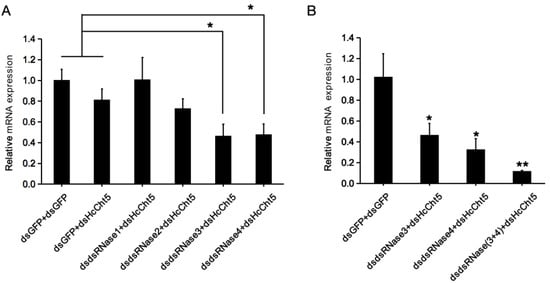 RNAi effects of dsRNase-silenced H. cunea larvae by injection of the dsRNA targeting gene HcCht5. (A) RNAi silencing of HcCht5 after individual silencing of HcdsRNase1, HcdsRNase2, HcdsRNase3, and HcdsRNase4. The 2-day-old fourth-instar larvae were injected with 6 μg of GFP-, dsRNase1-, dsRNase2-, dsRNase3-, or dsRNase4-dsRNAs for 48 h, and then injected with 2 μg dsGFP or dsHcCht5. Transcription levels of HcCht5 were assessed by RT-qPCR at 24 h post injection. (B) RNAi silencing of HcCht5 after co-silencing HcdsRNase3 and HcdsRNase4. The 2-day-old fourth-instar larvae were injected with 6 μg of GFP-, dsRNase3-, or dsRNase4-dsRNAs or a mixture of 6 μg each of dsRNase3- and dsRNase4-dsRNAs, after which the insects were injected with 2 μg of dsRNA targeting gene HcCht5. Transcription levels of HcCht5 were assessed by RT-qPCR post 24 h. Values represent the means and standard errors of three biological replicates. Asterisks indicate significant differences according to Student’s t-test (* p < 0.05; ** p < 0.01).