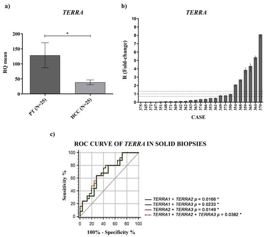 To characterize the expression of TERRA in HCC patients, we first examined TERRA levels in paired HCC and peritumoral tissues by RT qPCR. TERRA expression from different telomeres, analyzed using specific primer pairs (as described in the Materials and Methods, TERRA1 = 1_2_10_13q; TERRA2 = 15q; TERRA3 = XpYp), resulted to be significantly downregulated (Figure S1). TERRA expression was obtained as a mean of the different TERRA relative quantifications and, as shown in Figure 1a by the qPCR data, TERRA was significantly downregulated in HCC tissues compared with their matched peritumoral tissues (RQHCC average vs. RQPT average, p-value = 0.02).