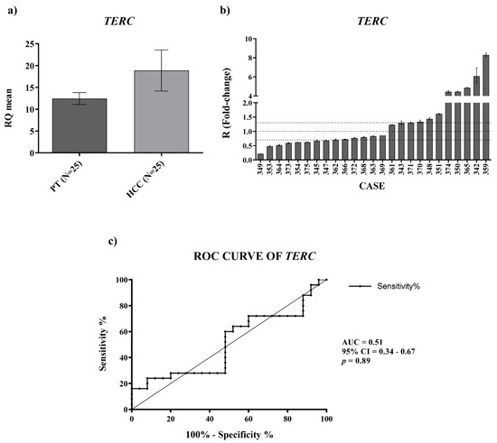 Given the importance of telomerase in HCC, we also investigated the expression of TERC and TERT mRNA in the paired HCC and peritumoral tissues by qPCR. For TERC expression, the data obtained displayed a trend of upregulation in HCC tissues compared with the PT ones (Figure 2a, RQHCC average vs. RQPT average, p-value = ns) and receiver operating characteristic (ROC) curve analysis did not disclose a significant capability in distinguishing HCC from PT tissues (Figure 2c) (AUC:0.51; CI: 0.34–0.67; p-value = 0.89).