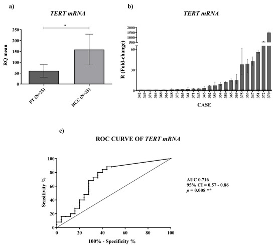 TERT mRNA expression (Figure 3a) was significantly upregulated (p-value = 0.019) at different orders of magnitude in HCC tissues compared to the PT ones (Figure 3b). ROC curve analysis of TERT mRNA expression revealed a successful significant ability in discriminating HCC from PT tissues (Figure 3c) (AUC: 0.716; CI: 0.57–0.86; p-value = 0.008). These findings suggest that quantification of TERRA and TERT mRNA may represent a discriminating tool to distinguish HCC from peritumoral tissue.