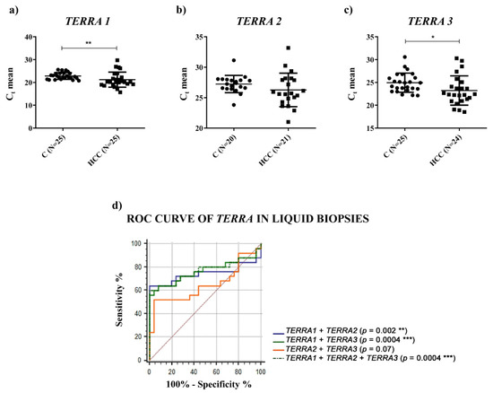 Plasma levels of TERRA. (a–c) TERRA levels in terms of Ct in plasma of healthy (C) and HCC individuals. TERRA expression from different telomers was analyzed using specific primers (TERRA 1 = hTel 1_2_10_13q; TERRA 2 = hTel 15q; TERRA 3 = hTel XpYp). Parametric unpaired two-tailed t-test. (d) ROC curve analysis of TERRA to discriminate HCC from healthy individuals. * p < 0.05, ** p < 0.01, *** p < 0.001.