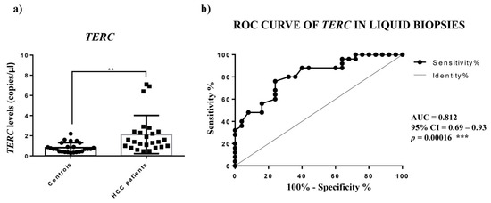 Plasma levels of TERC. (a) TERC levels in terms of copies/µL in plasma of control subjects (C) and HCC patients. Unpaired t-test was used. (b) ROC curve analysis of TERC to discriminate HCC from healthy individuals. ** p < 0.01; *** p < 0.001.