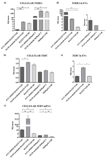 - Oh, B.K.; Keo, P.; Bae, J.; Ko, J.H.; Choi, J.S. Variable TERRA abundance and stability in cervical cancer cells. Int. J. Mol. Med. 2017, 39, 1597–1604. [Google Scholar] [CrossRef]