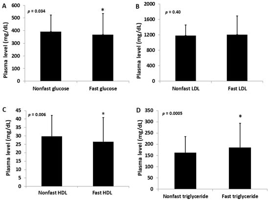 Fasting and non-fasting plasma levels of glucose (A), non-HDL (LDL) (B), HDL cholesterol (C), and triglycerides (D) in male F2 mice fed the Western diet. The results are expressed as means ± SD. * p < 0.05 vs. non-fasting measure.