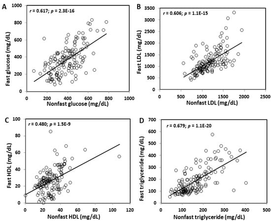 Fasting and non-fasting glucose levels were closely correlated (r = 0.617; p = 2.3 E−16) (Figure 2). Correlation coefficients between fasting and non-fasting lipid levels varied from 0.480 for HDL cholesterol (p = 1.5E−9) to 0.606 for non-HDL cholesterol (p = 1.1E−15) and 0.679 for triglycerides (p = 1.1E−20).