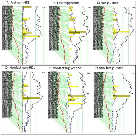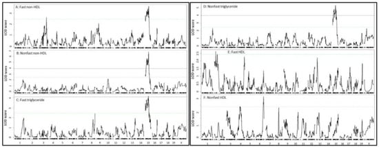 Despite similar plasma levels, non-HDL cholesterol and triglycerides showed a closer correlation with glucose levels under the non-fasting state compared to the fasting state. This result is consistent with the larger LOD scores of the lipid QTL for non-fasting than fasting non-HDL cholesterol and triglycerides. Non-fasting lipid levels predict risk for coronary heart disease and stroke better than fasting lipid levels [,]. Our current study suggests that this is partially due to the genetic connection hyperglycemia and type 2 diabetes, which contributes to plaque growth [].