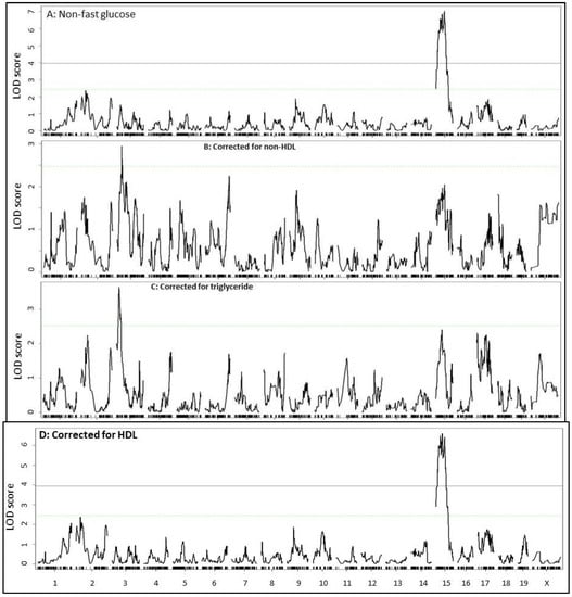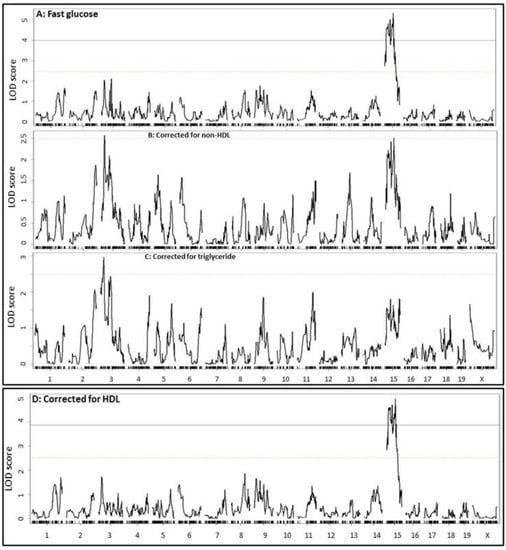 Similarly, when residuals from the regression analysis with non-fasting non-HDL cholesterol or triglyceride levels were analyzed, the significant QTL on Chr15 for non-fasting glucose disappeared (Figure 7). When residuals from the regression analysis with non-fasting HDL cholesterol levels were analyzed, the Chr15 QTL for non-fasting glucose showed little change. In addition, a suggestive QTL on Chr3 for plasma glucose levels showed up after eliminating the influence from fasting or non-fasting non-HDL cholesterol or triglycerides. This QTL peaked near 27 Mb and had a suggestive LOD score of 2.6~3.6.