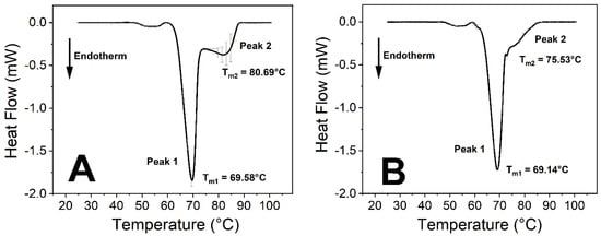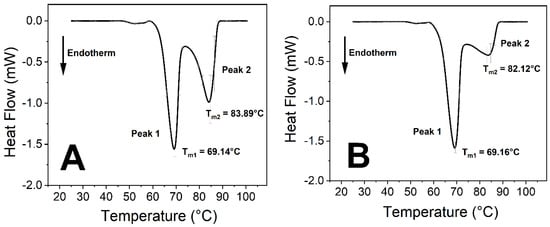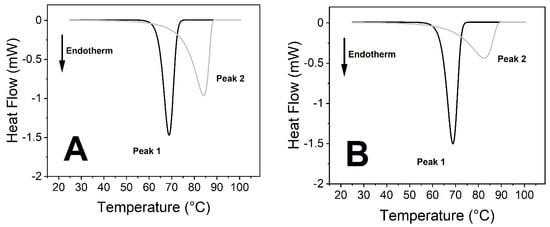 Deconvolution of peak 1 and peak 2 from Figure 3 DSC plots. (A) Control: 50 h of incubation at 37 °C. (B) Treated with SARS-CoV-2 and incubated for 50 h at 37 °C.