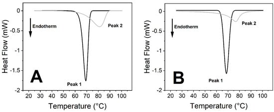 Deconvolution of peak 1 and peak 2 from Figure 1 DSC plots. (A) Control: 25 h of incubation at 37 °C. (B) SARS-CoV-2 treatment: incubated for 25 h at 37 °C.