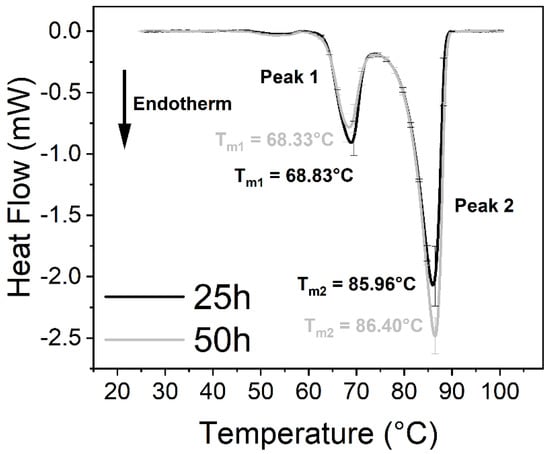 The most consistent results occurred at 37 °C, which is considered the normal body temperature. No significant differences were found between the virus-treated and the control blood samples when the incubation time was shorter than 15 h (Figures S1 and S3). However, drastic changes were seen after 15 h of incubation time (Figure 1 and Figure 3). The melting temperature of Peak 2 increased from 80.69 °C (25 h) to 83.89 °C (50 h) in the non-treated samples, which suggests that transferrin bound more Fe3+ ions, which might have been released from other blood sources. The under-curve area also grew considerably in the case of the control samples (Figure 1A, Figure 2A, Figure 3A, Figure 4A and Figure 6), indicating that more energy was required to denature the protein. These results indicate that, after the conformational change, transferrin ended up in a more stable configuration.