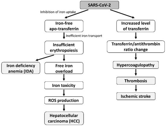 Iron is essential for the human body, and its regulation requires the precisely coordinated functioning of many proteins (e.g., transferrin, ferroportin, ferritin, lactoferrin, hepcidin). One of the most important tasks of this coordinated function is to keep free iron levels in the blood low. Increased serum iron levels generate reactive oxygen species (ROS) and also provide an ideal environment for microbial multiplication []. Based on previous findings [], SARS-CoV-2 can influence the transferrin-mediated iron transport processes, which leads to ineffective erythropoiesis that may cause IDA. HCC and organ impairment can also develop as a late complication of iron-toxicity-induced ROS production that is caused indirectly by SARS-CoV-2 [,,,]. Moreover, the increased level of transferrin and the change in the transferrin/antithrombin ratio [,] can lead to the dysfunction of the coagulation system, especially in males, which results in COVID-19-related hypercoagulopathy, thrombosis, and ischemic stroke (Figure 7). The risk of all-cause mortality was found to increase with elevated serum transferrin saturation levels []. The schematic model of the effect of SARS-CoV-2 is represented in Figure 8. It is also known that SARS-CoV-2 infection can directly influence the oxygen uptake by destroying the lung tissues and inducing long-term fibrosis in the lung parenchyma [,].