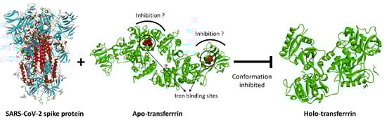 Similar to transferrin, lactoferrin can also chelate two ferric ions with very high affinity (though the presence of a carbonate ion is required for stabilizing the iron binding). We can distinguish an iron-free apo-lactoferrin conformation and a highly stable iron-bound holo-lactoferrin, such as in the case of transferrin []. Lactoferrin has anti-inflammatory, antiviral, and immunomodulatory activities, and is expressed and secreted by glandular epithelial cells (as well as by neutrophil cells) when they are involved in immune processes []. Due to its beneficial effects, lactoferrin is considered an efficient natural weapon against COVID-19 [], and its antiviral effect was successfully proven experimentally. This protein can exert its antiviral activity by binding directly to the particles of SARS-CoV-2. Lactoferrin molecules can also obscure the host cell receptors of the virus []. Clinical studies proved the effectiveness of lactoferrin in the fight against the SARS-CoV-2 virus in asymptomatic and mild-to-moderate COVID-19 patients []. However, one has to be extremely cautious with the mode and timing of the administration of this protein []. These findings showed that both transferrin and lactoferrin acted against elevated free iron levels. Interestingly, low iron levels can also trigger certain pathological conditions. Clinical studies reported that decreased levels of hemoglobin, free iron, transferrin, and ferritin might result in increased coagulability and indicate iron deficiency anemia, even if the platelet count and coagulation levels fell in the normal range in pediatric patients []. Moreover, this increased coagulability can be triggered or amplified by contraceptives (estrogen), which can result in ischemic stroke and/or venous thromboembolism [].