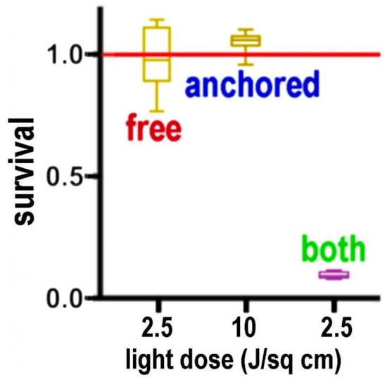 Photokilling in 3D culture showing the synergistic effect of simultaneously targeting mitochondria and ER with benzoporphyrin derivative (BPD). Free BPD targets mitochondria > ER; ‘anchored’ BPD targets lysosomes. See Ref. [] for further details.
